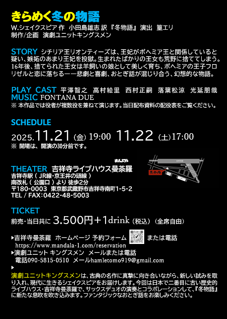 | その他注意事項 | シェイクスピア × サックス 『きらめく冬の物語』 シェイクスピアのロマンス劇『冬物語』を、伝説のライブハウス曼荼羅で。今回はサックスとのコラボレーション。前回のメタルロックに続き、ふたたび五感で味わう斬新なシェイクスピアをお届けします。 喜劇と悲劇が入り混じる、幻想的なおとぎ話を、臨場感あふれる演劇と演奏でお楽しみください。 |